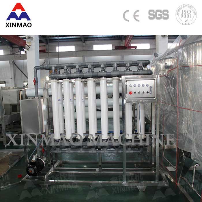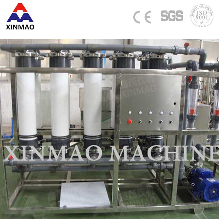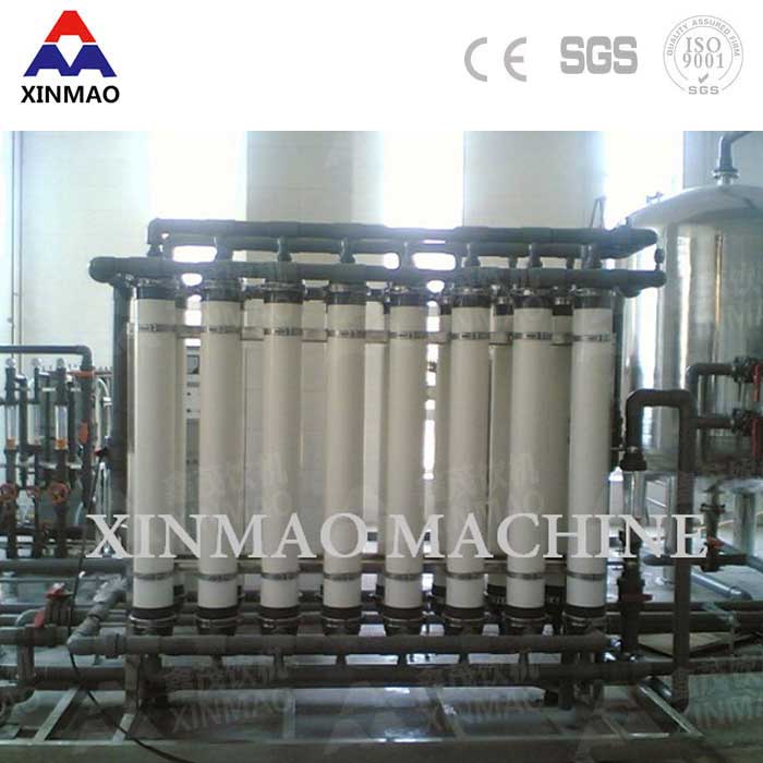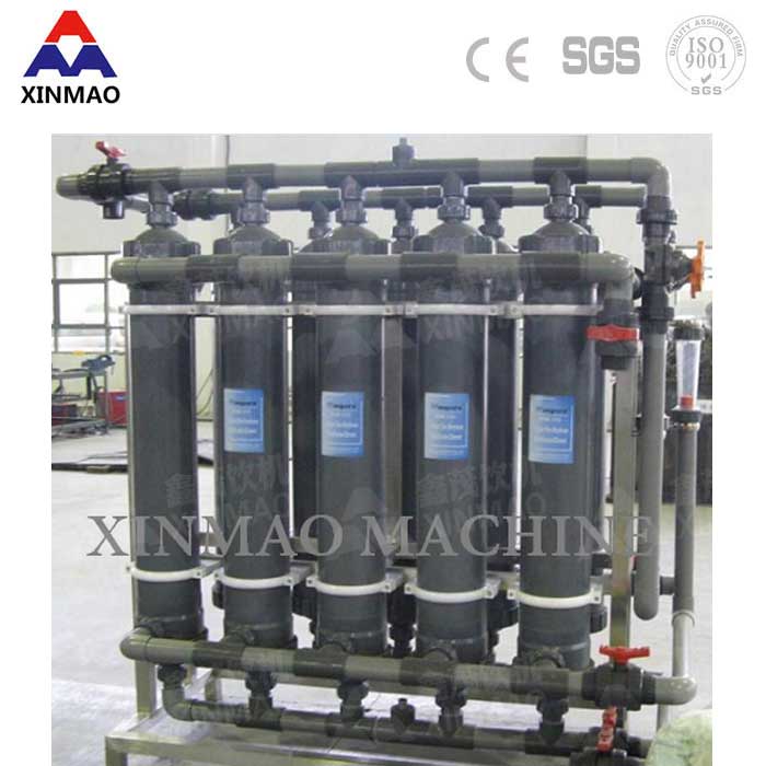 超濾(UF)裝置是一種先進的膜分離技術,料液中含有的溶劑及各種小的溶質(zhì)從高壓料液側透過濾膜到達低壓側,從而得到透過液或稱為超濾液;其超濾膜微孔可達0.01微米(十萬分之一毫米)以下,能有效地去除水中的微粒、膠體、細菌、熱源和有機物,而尺寸比膜孔徑大的溶質(zhì)分子被膜截留成濃縮液。鑫茂