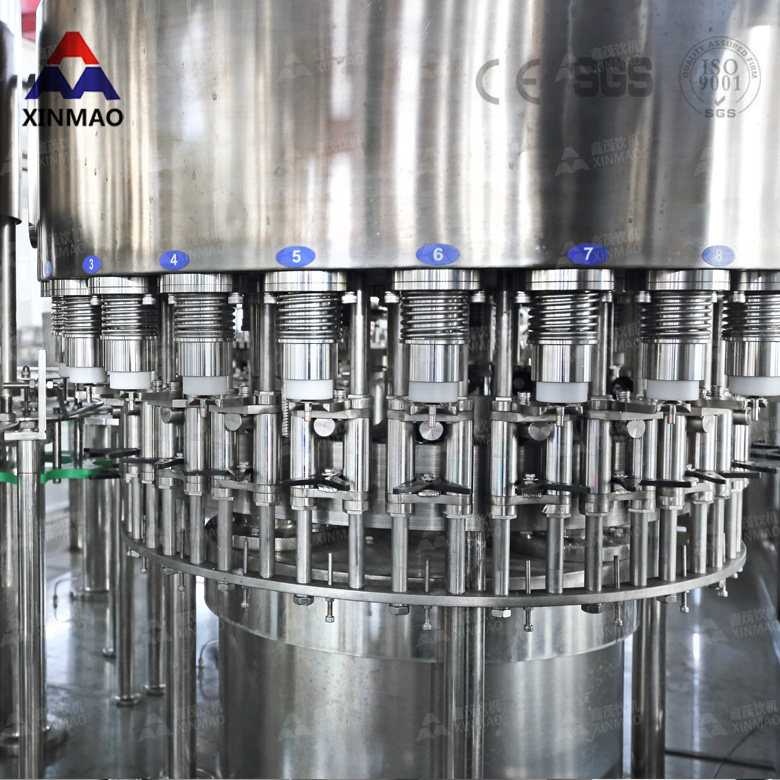 (4)、中型瓶三合一純凈水灌裝機(jī)采用高速灌裝閥,液位準(zhǔn)確無液損,確保灌裝工藝要求;