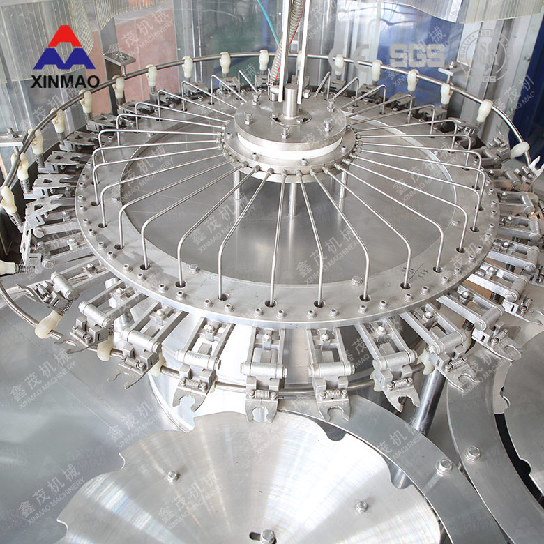 3. 三合一機(jī)組內(nèi)部一次完成洗瓶、灌裝、封蓋三道工序,瓶子磨損小、傳動(dòng)準(zhǔn)確平穩(wěn)、瓶型更換便捷。