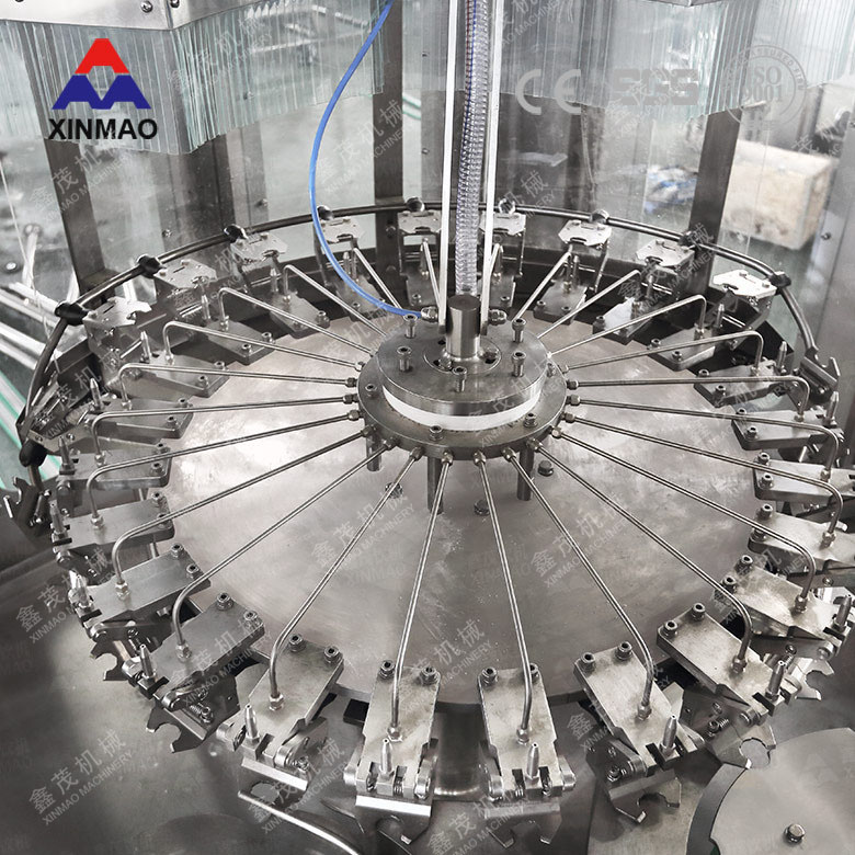 1.進瓶采用風(fēng)送裝置,采用懸掛卡瓶頸方式,上瓶速度快且不會使瓶子變形;