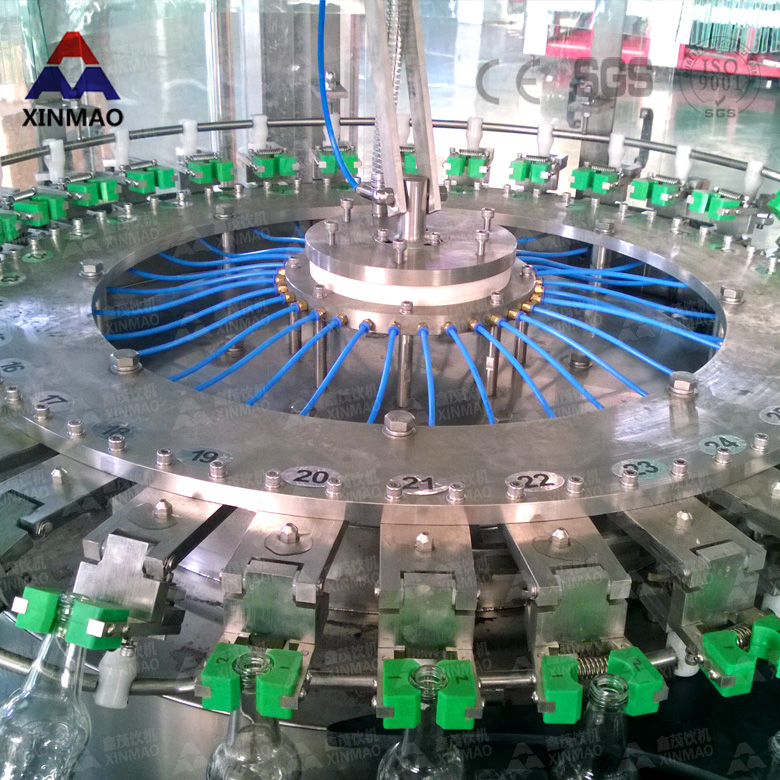 玻璃瓶三合一雞尾酒灌裝機機組內(nèi)部一次完成洗瓶、灌裝、封蓋三道工序,瓶子磨損小、傳動準(zhǔn)確平穩(wěn)、瓶型更換便捷。 特殊設(shè)計的沖瓶機瓶夾結(jié)實耐用,不接觸瓶口螺紋部位,避免瓶口二次污染。 與液體接觸的零部件全采用優(yōu)質(zhì)不銹鋼材料或食品級工程塑料,符合國家食品衛(wèi)生標(biāo)準(zhǔn) 。 出瓶撥輪瓶底托板采用螺旋下降方式,變換瓶型無須調(diào)整出瓶輸送鏈高度。玻璃瓶三合一雞尾酒灌裝機在吸收國外先進技術(shù)的基礎(chǔ)上研制設(shè)計而成的,在一體機上實現(xiàn)沖洗、灌裝、旋蓋的功能,主要用于玻璃瓶含氣飲料如汽水、可樂、雞尾酒的生產(chǎn)。
