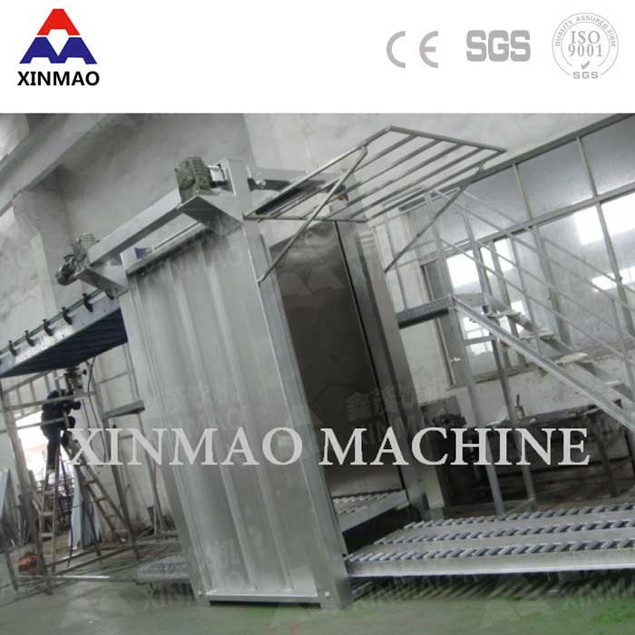 工作時(shí)由叉車將疊滿的棧板置于棧板輸送機(jī)上,然后輸送機(jī)再將之輸送至主機(jī)的棧板升降臺(tái)上。棧板升降臺(tái)是將定位后的空罐棧板升送至卸罐高度,當(dāng)卸完空罐后,再將空棧板降下置于輸送機(jī)上。所有上升、下降的動(dòng)作全部由自鎖式升降系統(tǒng)裝置控制,并能單獨(dú)調(diào)整上升或下降的速度,以配合操作上的需要。 卸空罐是由氣缸裝置進(jìn)行推罐,當(dāng)空罐送至卸罐高度后擋罐部件的氣缸動(dòng)作擋住前排空罐,以防空罐倒罐現(xiàn)象,將整層的空罐推至網(wǎng)式輸送機(jī)上,然后擋罐部件自動(dòng)翻轉(zhuǎn),回歸至準(zhǔn)備位置,繼續(xù)將下一層推出。卸完空罐后的空棧板,藉由空棧板輸送機(jī)移出。