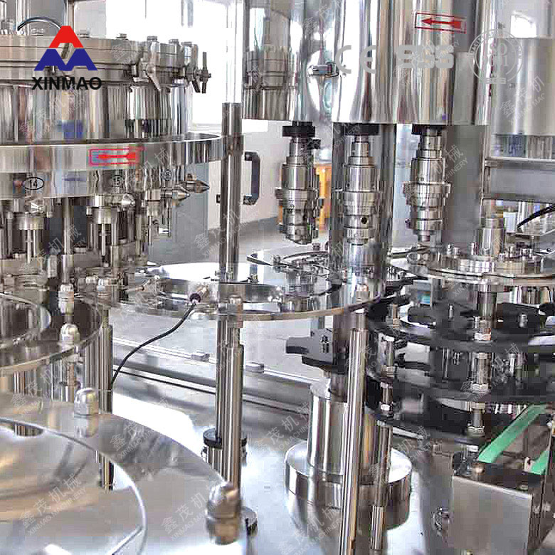 鑫茂飲料機(jī)械生產(chǎn)的碳酸飲料灌裝設(shè)備將沖洗、灌裝、封蓋三功能組合在一個(gè)機(jī)體上,全過程實(shí)現(xiàn)自動(dòng)化,適用于適用于灌裝可口可樂、雪碧、含氣蘇打水等含二氧化碳?xì)怏w的飲料。